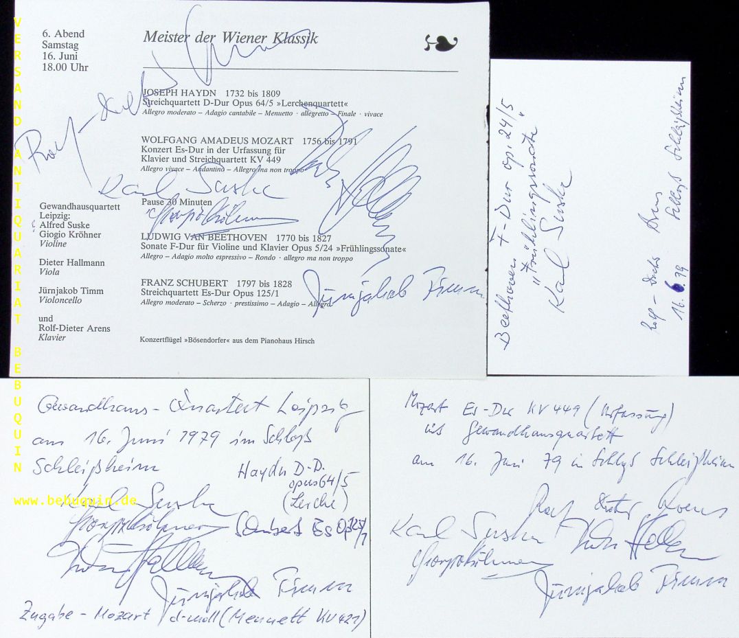 GEWANDHAUS QUARTETT.– SUSKE, Karl + KRÖHNER, Giorgio + HALLMANN, Dietmar + TIMM, Jürnjakob + ARENS, Rolf-Dieter: eigenhändig von allen signierte Programmseite + 3 zumeist von allen signierte und datierte Autogrammkarten. München (Schloß Schleißheim), 16.6.1979. 10,5 x 14,5 cm. 4 Bl. Das Gewandhaus-Quartett (auch: Leipziger Gewandhaus-Quartett) ist ein Streichquartettensemble, das 1808 gegründet wurde. Es war eines der ersten Berufsquartette der Welt. In seiner über 200-jährigen Geschichte oblag ihm die Ehre vieler Uraufführungen. (Wikipedia)
