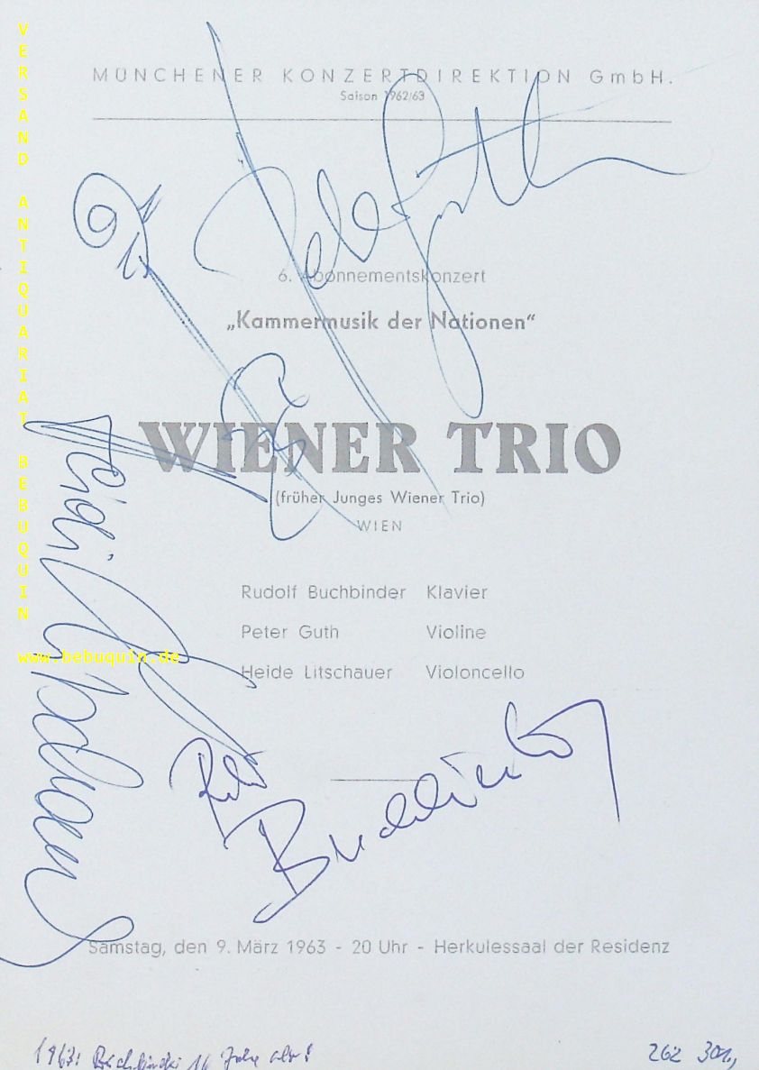 WIENER TRIO.– BUCHBINDER, Rudolf + GUTH, Peter + LITSCHAUER, Heide: eigenhändig von allen signierte Programmseite. München (Herkulessaal), 9.3.1963. 20 x 14 cm. 1 Bl. Rudolf Buchbinder (* 1. Dezember 1946 in Litomerice, Tschechoslowakei) ist ein österreichischer Pianist.