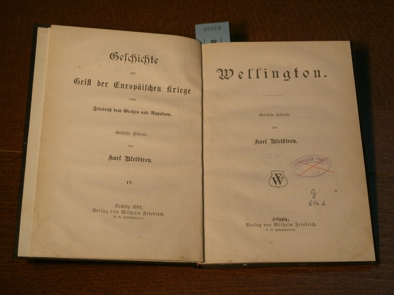 NAPOLEON.– BLEIBTREU, Carl: Wellington. Kritische Historie. Leipzig (Friedrich), 1893. VI, 104 S. HLn der Zeit. Ordnungsgemäß aus Bundeswehrbeständen ausgesondertes Bibliotheksexemplar (Stempel, Rückenschild). = Geschichte und Geist der Europäischen Kriege unter Friedrich dem Großen und Napoleon, Bd. IV. EA. WG 42,4.