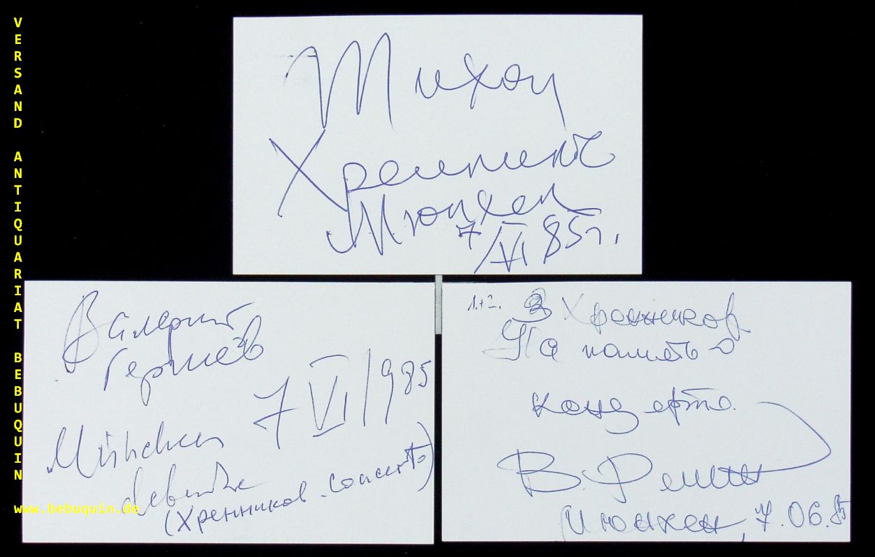 CHRENNIKOW, Tichon (Komponist + Pianist) + REPIN, Vadim (Violinist) + GERGEJEW, Walerij (Dirigent): 3 eigenhändig von allen signierte und datierte Autogrammkarten. München (Herkulessaal), 7.6.1985. 8 x 12,5 cm. 6 Bl. Tichon Nikolajewitsch Chrennikow (* 28. Maijul./ 10. Juni 1913greg. in Jelez, Gouvernement Orjol, Russisches Reich, heute Oblast Lipezk, Russland; † 14. August 2007 in Moskau) war ein russischer Komponist. (Wikipedia)