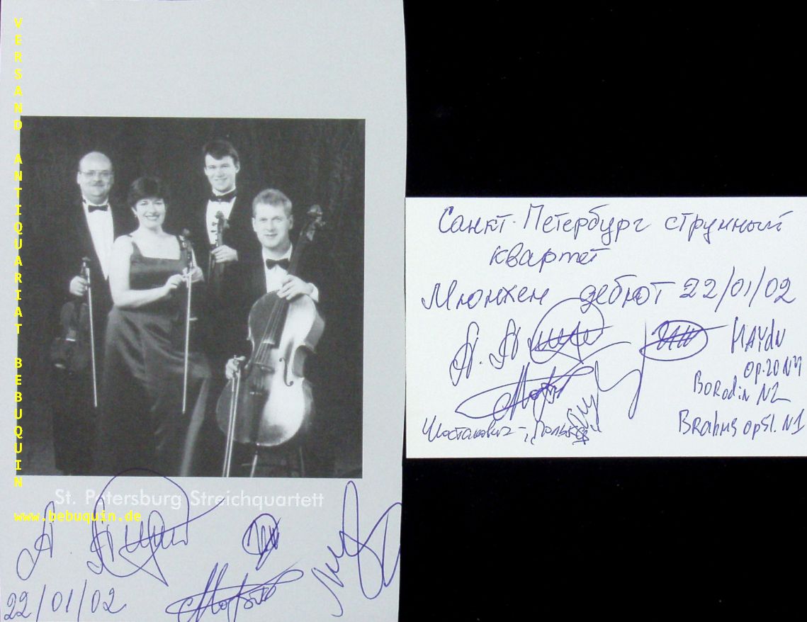 ST. PETERSBURG STREICHQUARTETT.– ARANOVSKAYA, Alla + TEPLYAKOV, Ilya + KOPTEV, Alexei + SHUKAEV, Leonid: eigenhändig von allen signierte Portraitseite + signierte und datierte Autogrammkarte. München (Herkulessaal), 22.1.2002. 20 x 13 cm 4 Bl. Das St. Petersburg String Quartet ist ein russisches Streichquartett seit 1985. Ihre Interpretationen und Aufnahmen von Streichquartetten aus Schostakowitsch, Tschaikowsky, Borodin, Prokofjew und Glasunow sind auf den Labels Sony, Melodiya, Hyperion, Delos, Dorian und Marquis zu finden. (Wikipedia)
