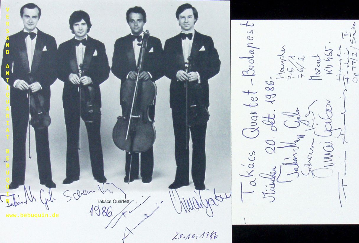 TAKACS QUARTETT.– TAKASC-NAGY, Gabor + SCHRANZ, Karoly + ORMAI, Gabor + FEJER, Andras: eigenhändig von allen vier Künstlern signierte und datierte Autogrammkarte sowie eine ebenfalls von allen signierte Portraitseite. München (Philharmonie), 20.10.1986. 15 x 13 + 8 x 12,5 cm. 3 Bl. The Takács Quartet is a string quartet, founded in Hungary, and now based in Boulder, Colorado, United States. (Wikipedia)