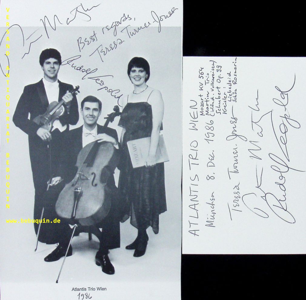 ATLANTIS TRIO WIEN.– MATZKA, Peter + LEOPOLD, Rudolf + TURNER-JONES, Teresa: eigenhändig signierte und datierte Autogrammkarte + ebensolche Portraitseite über dem Foto von allen eigenhändig signiert und datiert. München (Philharmonie), 20.11.1980. 20 x 15 cm. 3 Bl.