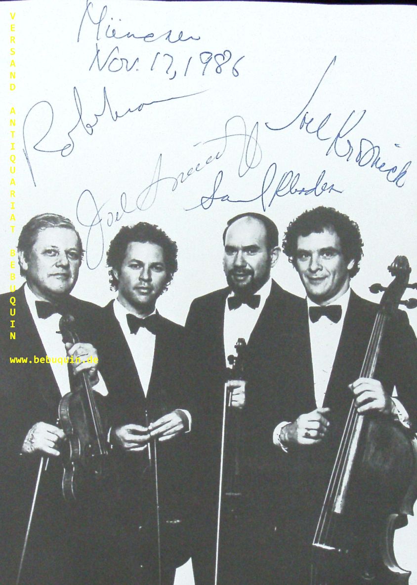 JUILLARD STRING QUARTET.– MANN, Robert + SMIRNOFF, Joel + RHODES, Samuel + KROSNICK, Joel: eigenhändig von allen signierte und datierte Portraitseite. München (Philharmonie), 12.11.1986. 20 x 14,5 cm. 2 Bl. Das Juilliard String Quartet gehört seit 1947, dem Jahr seines ersten Auftretens, zu den führenden Streichquartettensembles der Welt. Mit über 100 Veröffentlichungen ist das Juilliard String Quartet eines der am meisten aufgenommenen Streichquartettensembles der Welt und konnte bislang vier Grammys gewinnen. (Wikipedia)