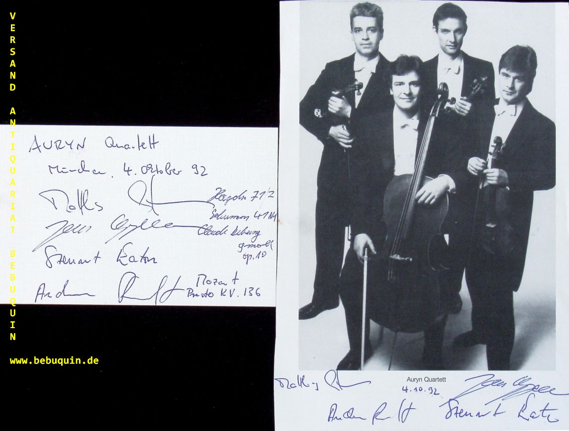 AURYN QUARETT.– LINGENFELDER, Matthias + OPPERMANN, Jens + EATON, Steuart + ARNDT, Andreas: eigenhändig signierte und datierte Autogrammkarte + eigenhändig signierte Portraitseite. München (Herkulessaal), 4.10.1992. 20 x 13 cm. 3 Bl. Das Auryn Quartett, gegründet 1981, ist ein international renommiertes Streichquartett. Die vier Gründungsmitglieder Andreas Arndt (Cello), Stewart Eaton (Bratsche) und die beiden Violinisten Matthias Lingenfelder (* 1959) und Jens Oppermann (* 1960) bilden bis heute das Ensemble. (Wikipedia)