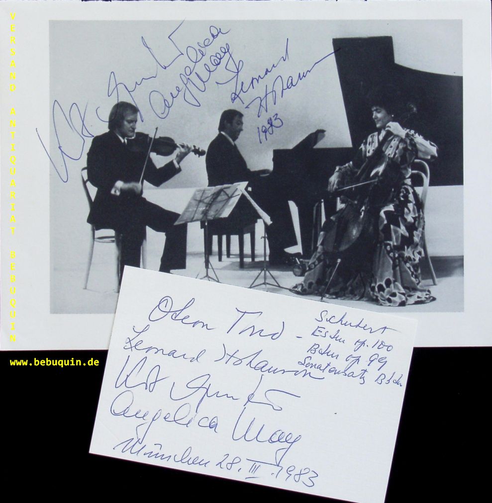 ODEON TRIO.– MAY, Angelica (Cellistin) + GUNTNER, Kurt (Violinist) + HOKANSON, Leonard (Pianist): eigenhändig von allen signierte und datierte Autogrammkarte + ebenfalls von allen Signierte Portraitseite. München (Herkulessaal), 28.3.1983. 3 Bl. Autogramme von Angelica May (17.9.1933 – 7.1.2018) sind von großer Seltenheit. Angelica May war eine der renommiertesten deutschen Cellistinnen der Nachkriegszeit. Sie hatte das Glück, noch beim großen Pablo Casals studieren zu können. Angelica May gehörte zu den wenigen deutschen Cellistinnen, die sich nach dem Zweiten Weltkrieg einen internationalen Ruf erspielen konnten.