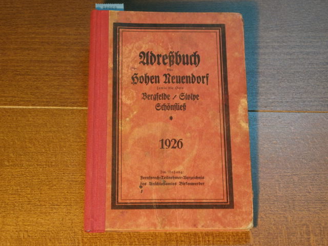 HOHEN NEUENDORF.– ADRESSBUCH FÜR HOHEN NEUENDORF 1926.– Und die Gemeinden des Amtsbezirks Schönfließ, Bergfelde, Stolpe, Schönfließ. Bearb. nach amtlichem Material von W. Säuberlich. Hohen Neuendorf (Nordbahn), 1926. Gr. 8°. 176 S. + umfangreicher Werbanhang aufc verschiedenfarbigem Papier. OPb mit neuem Leinenrücken. Deckel etwas fleckig, Vorsätze erneuert, Buchblock stabilisiert, insgesamt gut. Seltenes Adressbuch.