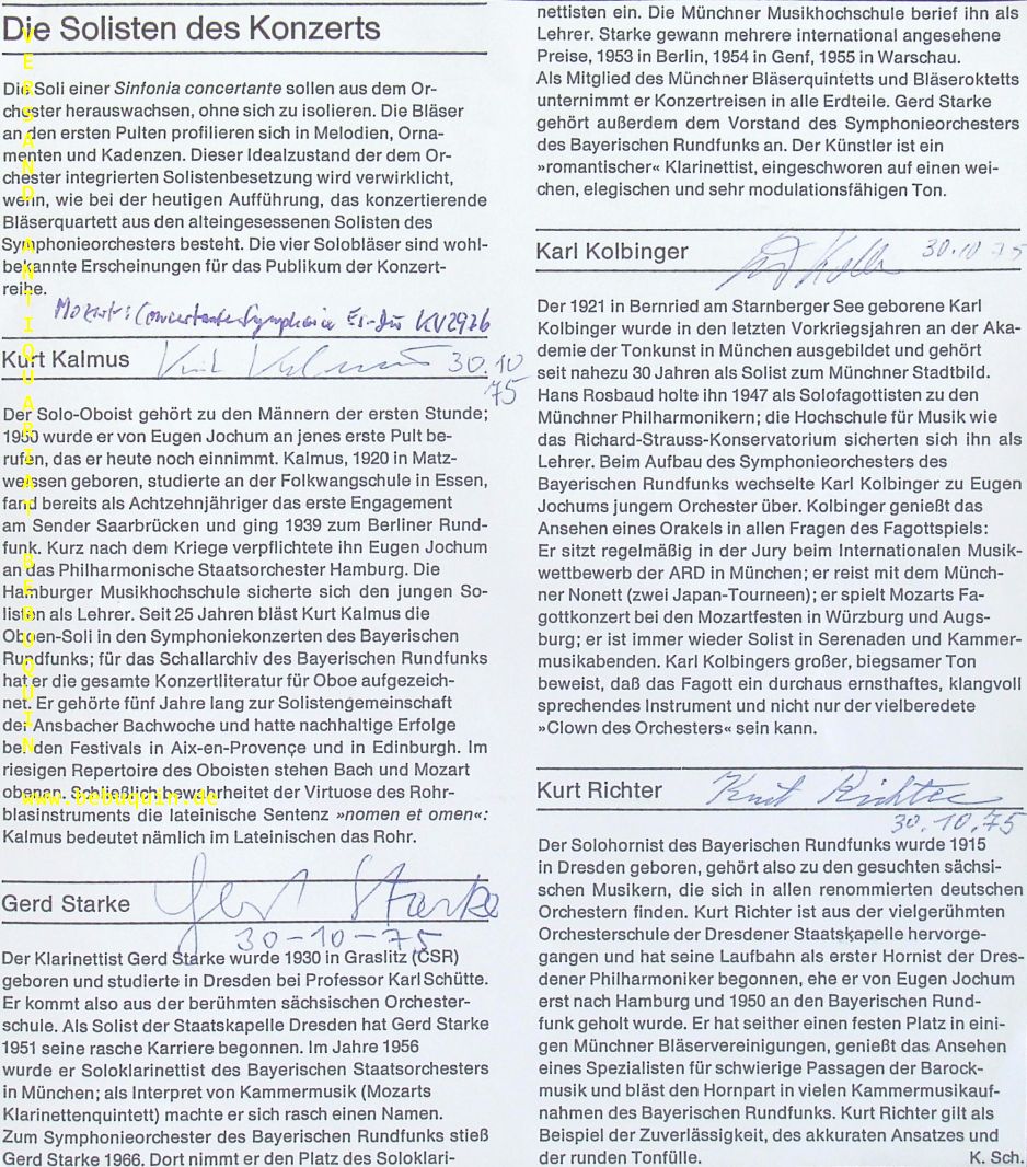 SOLOBLÄSER.– KALMUS, Kurt + STARKE, Gerd + KOLBRINGER, Karl + RICHTER, Kurt: eigenhändig von allen signierte und datierte Programmseite. München (Herkulessaal); 30.10.1975. 22 x 19 cm. 1 Bl.