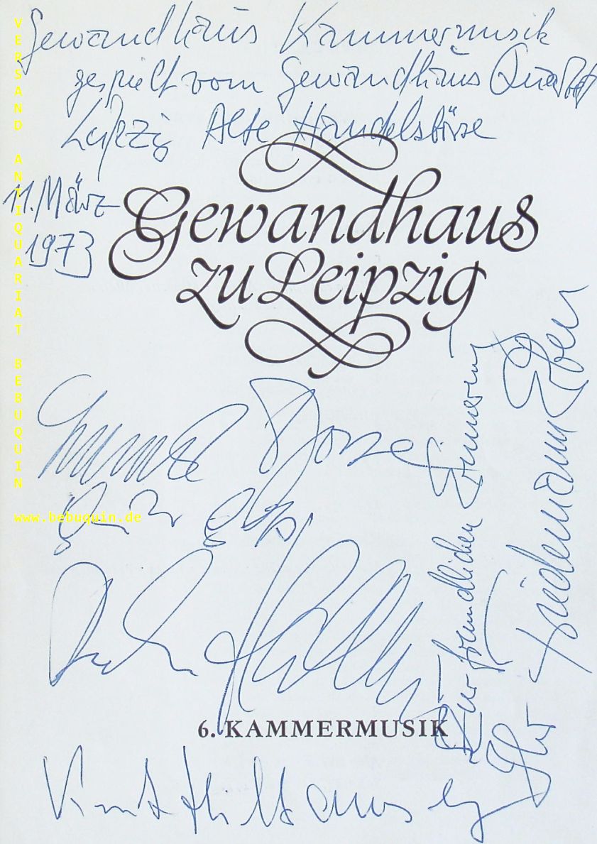 GEWANDHAUS QUARTETT.– BOSSE, Gerhard + GLASS, Günter + HALLMANN, Dietmar + ERBEN, Friedemann + HILTAWSKY, Kurt: eigenhändig von allen signierte Programmseite. Leipzig, 11.3.1973. 21 x 15 cm. 2 Bl. Das Gewandhaus-Quartett (auch: Leipziger Gewandhaus-Quartett) ist ein Streichquartettensemble, das 1808 gegründet wurde. Es war eines der ersten Berufsquartette der Welt. In seiner über 200-jährigen Geschichte oblag ihm die Ehre vieler Uraufführungen. (Wikipedia)