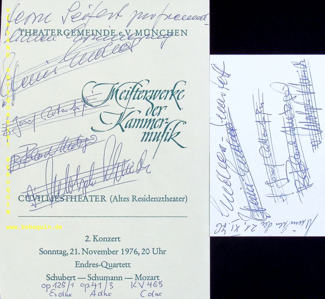 ENDRES QUARTETT.– ENDRES, Heinz + ROTTENFUSSER, Josef + METZGER, Roland + SCHMIDT, Adoilf: eigenhändig von allen signierte und datierte Autogrammkarte und ebensolche mit persönlicher eigenhändigen Widmung auf Programmseite. München (Herkulessaal), 21.11.1976. 21 x 15 cm. 2 Bl.
