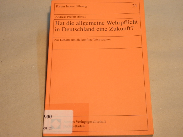 PRÜFERT, Andreas: (Hrsg.) Hat die allgemeine Wehrpflicht in Deutschland eine Zukunft? Zur Debatte um die künftige Wehrstruktur. Baden-Baden (Nomos), 2003. Gr. 8°. 106 (2) S. OKart. Ordnungsgemäß aus Bundeswehrbeständen ausgesondertes Bibliotheksexemplar (Stempel, Rückenschild). = Forum Innere Führung, Bd 21. EA.