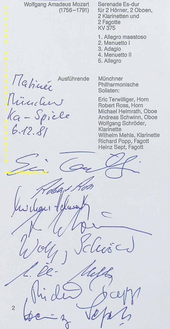 TERWILLIGER, Eric (Hornist) ROSS + HEIMTRATH + SCHWINN + SCHRÖDER + MEHLIS + POPP + SEPT: eigenhändig von allen signierte und datierte Programmseite. München, 6.12.1981. 19 x 10 cm. Karteikarte. = MATINEE. Eric Terwilliger spielt leidenschaftlich gern Kammermusik und war Mitglied der Münchner Philharmonischen Solisten von 1977 bis 1992. Er ist seit 1991 Mitglied des Wiener Kammerensembles.(Wikipedia)
