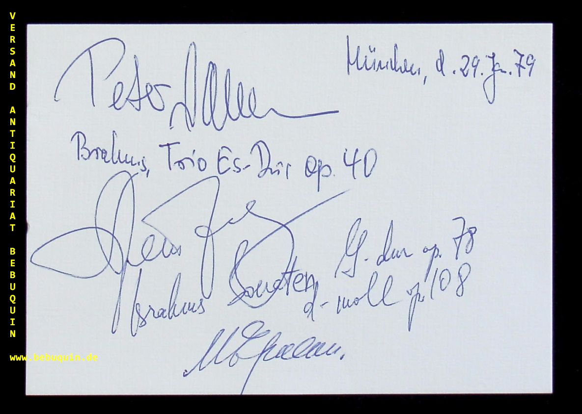 TRETJAKOW, Victor + EROCHIN, Michail + DAMM, Peter: eigenhändig von allen signierte Autogrammkarte. München (Herkulessaal), 29.1.1979. 10,5 x 14,5 cm. 3 Bl. Wiktor Wiktorowitsch Tretjakow (* 17. Oktober 1946 in Krasnojarsk, Sibirien) ist ein russischer Violinist und Dirigent. (Wikipedia)