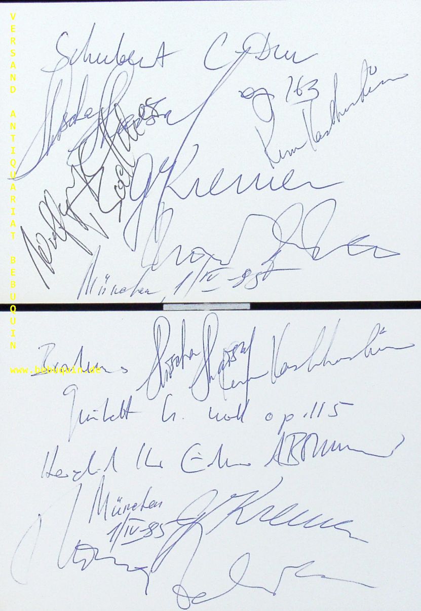 KREMER, Gidon + ZEHETMAIR, Thomas + KASHKASHIAN, Kim + MAISKY, Mischa + BOETTCHER, Wolfgang + BRUNNER, Eduard: 2 eigenhändig von allen signierte und datierte Autogrammkarten. München (Herkulessaal), 1l4l1985. 10,5 x 14,5 cm. 6 Bl. Gidon Kremer (* 27. Februar 1947 in Riga, Lettische SSR, UdSSR) ist ein ehemals sowjetischer, heute lettisch-deutscher Violinist. Thomas Zehetmair (* 23. November 1961 in Salzburg) ist ein österreichischer Violinist und Dirigent. Kim Kashkashian (* 31. August 1952 in Detroit) ist eine amerikanische Bratschistin armenischer Abstammung. Mischa Maisky (* 10. Januar 1948 in Riga, Sowjetunion, heute Lettland) ist ein klassischer Cellist und gilt als einer der besten Cellisten der Gegenwart. Er lebt heute in Waterloo bei Brüssel. Wolfgang Boettcher (* 30. Januar 1935 in Berlin) ist ein deutscher Cellist. Eduard Brunner (* 14. Juli 1939 in Basel; † 27. April 2017 in München) war ein Schweizer Klarinettist und Hochschullehrer. (Wikipedia)