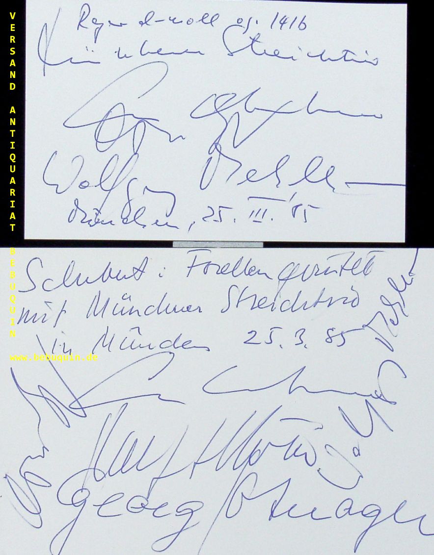 MÜNCHNER STRERICHTRIO.– CHUMACHENKO, Ana + LYSY, Oscar + MEHLHORN, Wolfgang + ADORJAN, Andras + GOTHONI, Ralf + HÖRTNAGEL, Georg: 2 eigenhändig von allen signierte und datierte Autogrammkarten. München (Herkulessaal), 25.3.1985. 10,5 x 14,5 cm. 7 Bl. András Adorján (* 26. September 1944 in Budapest) ist ein ungarischer Flötist.