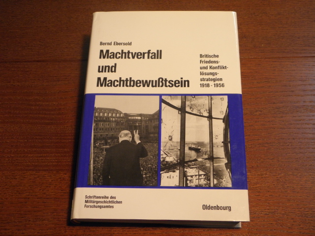 EBERSOLD, Bernd: Machtverfall und Machtbewußtsein. Britische Friedens- und Konfliktlösungsstrategien 1918 – 1956. München (Oldenbourg), 1992. Gr. 8°. 447 S. OLn mit OUmschl. Ordnungsgemäß aus Bundeswehrbeständen ausgesondertes Bibliotheksexemplar (Stempel, Rückenschild). = Beiträge zur Militärgeschichte, Bd. 31. EA.