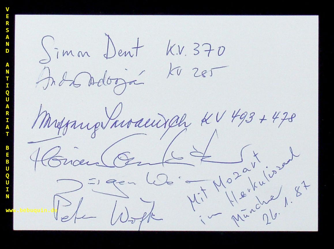 SAWALLISCH, Wolfgang (Dirigent) + ADORJA, Andras + DENT, Simon + SONLEITNER, Florian + WEBER, Jürgen + WÖPKE, Peter: eigenhändig von allen signierte und datierte Autogrammkarte. München, 26.1.1987. 10,5 x 14,5 cm. 5 Bl. Wolfgang Sawallisch (* 26. August 1923 in München; † 22. Februar 2013 in Grassau) war ein deutscher Dirigent und Pianist. Hermann Oskar Karl Bruno Prey (* 11. Juli 1929 in Berlin; † 22. Juli 1998 in Krailling) war ein deutscher Opernsänger (Bariton). (Wikipedia)