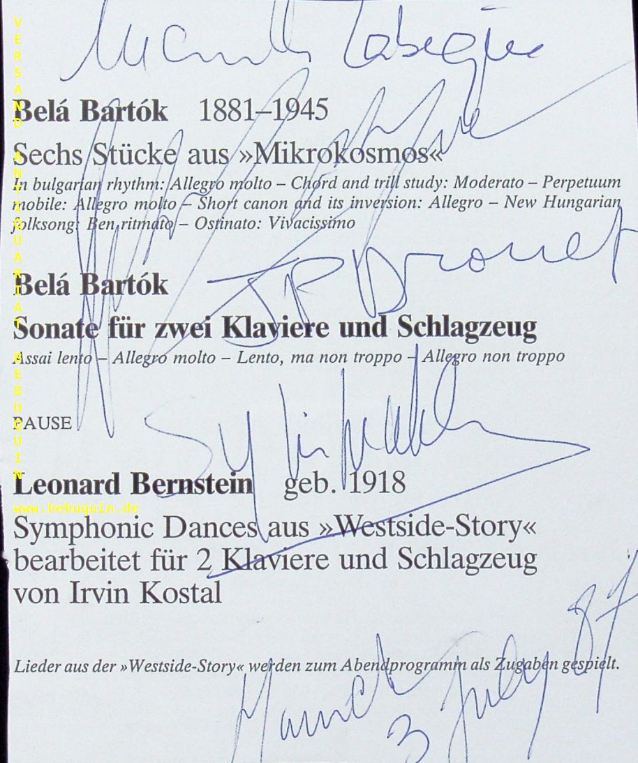 DROUET, Jean-Pierre + GUALDA, Silvio (Schlagzeuger) + LABEQUE, Katia & Marielle (Pianistinnen): eigenhändig von allen signierte und datierte Programmseite. München (Philharmonie), 3.7.1987. 16 x 13 cm. 1 Bl. etwas eng beschnitten.