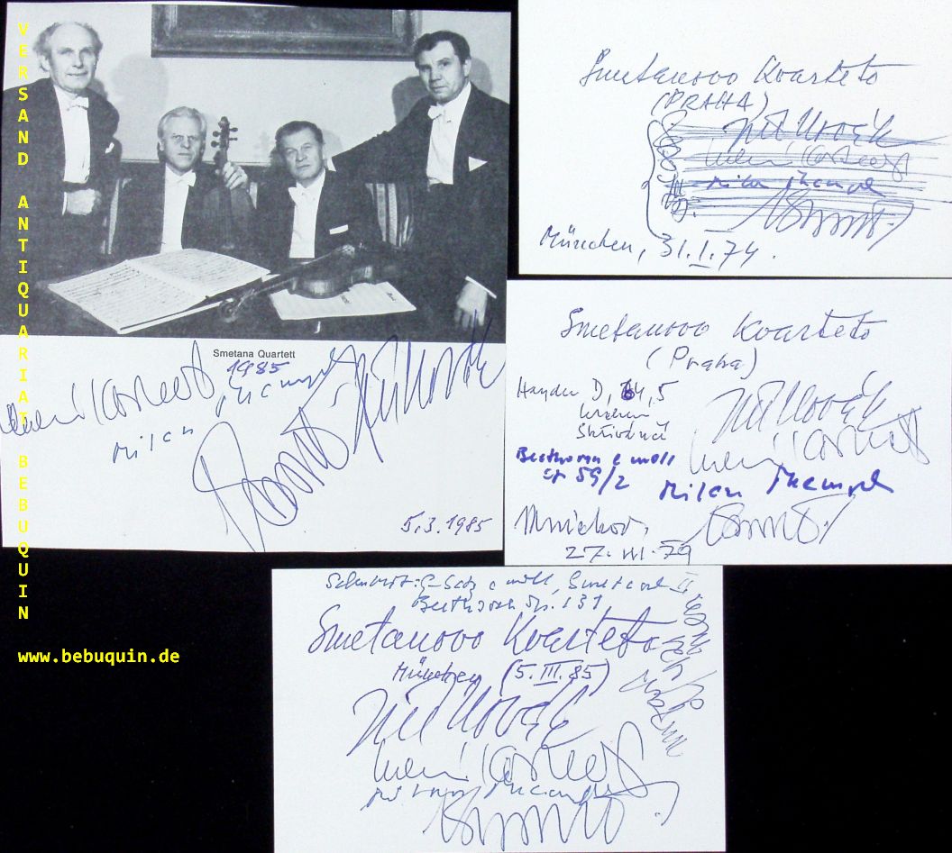 SMETANA-QUARTETT.– KOHOUT, Antonin + NOVAK, Jiri + KOSTECKY, Lubomir + SKAMPA, Milan: 3 eigenhändig von allen signierte und datierte Autogrammkarte. München, 1974 – 1985. 8 x 12.5 cm. 3 Karteikarten. Das Smetana-Quartett war ein tschechisches Streichquartett, das von 1945 bis 1989 bestand. Es entstand aus dem Streichquartett des Tschechischen Konservatoriums, das 1943, während der nationalsozialistischen Besatzungszeit, vom Cellisten Antonin Kouhout gegründet worden war. (Wikipedia)