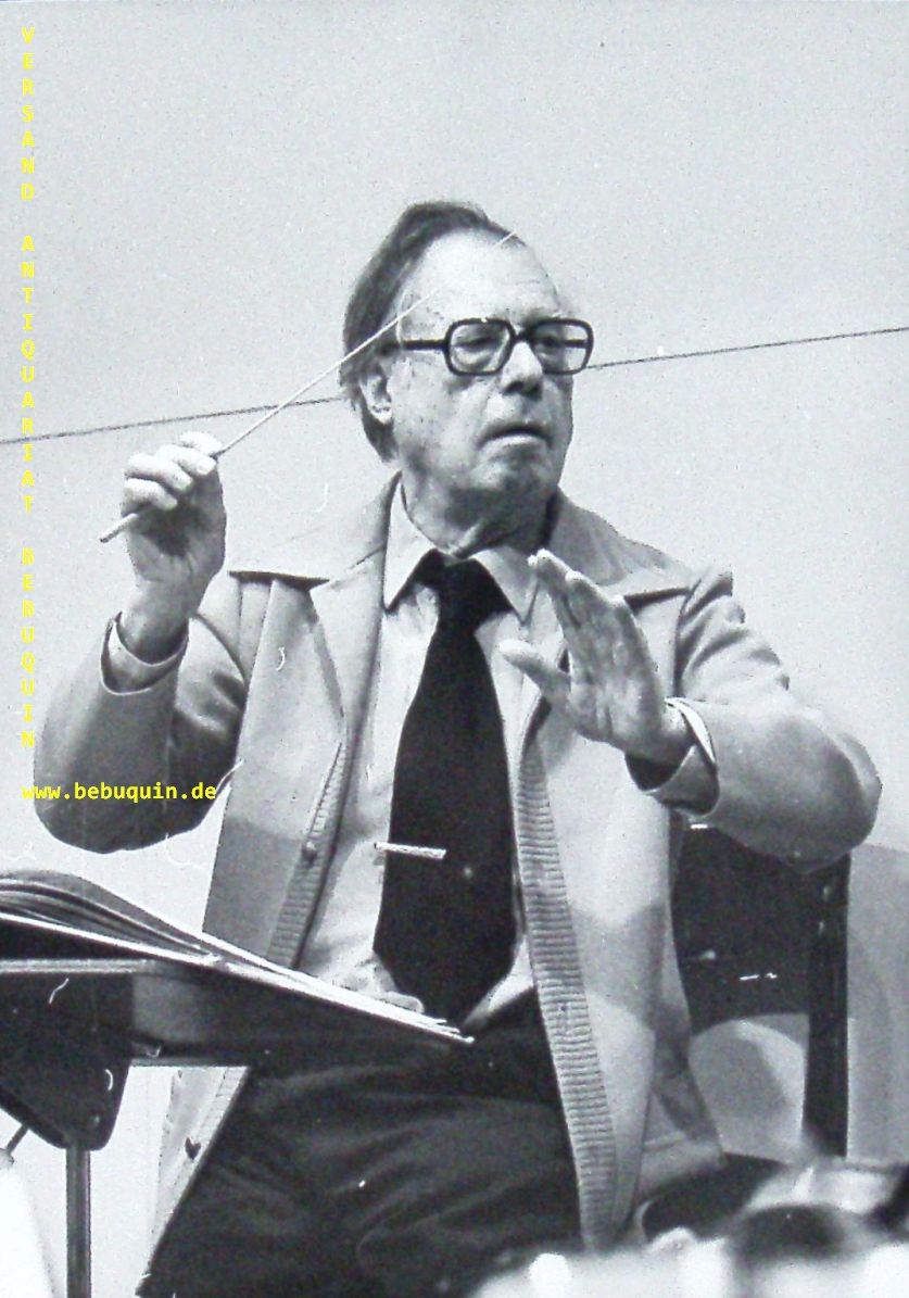 BÖHM, Karl (Dirigent): Portraitpostkarte von Anne Kirchbach. München (Philharmonie), ca 1970. 15 x10,5 cm. 1 Karte. Karl August Leopold Böhm (* 28. August 1894 in Graz, Österreich-Ungarn; † 14. August 1981 in Salzburg) war ein österreichischer und deutscher Dirigent. Seine Dirigentenkarriere begann 1917 in seiner Heimatstadt Graz. Mit der Unterstützung von Bruno Walter berief man ihn 1921 nach München. 1927 wurde er Generalmusikdirektor in Darmstadt, ab 1931 in derselben Funktion in Hamburg. 1934 wurde er Nachfolger von Fritz Busch an der Dresdner Semperoper. Diese Stelle hatte er bis 1943 inne, als er das erste Mal Direktor der Wiener Staatsoper wurde.[1] In der Endphase des Zweiten Weltkriegs wurde er im August 1944 in die von Adolf Hitler genehmigte Gottbegnadeten-Liste der wichtigsten Dirigenten aufgenommen, was ihn vor einem Kriegseinsatz, auch an der Heimatfront, bewahrte. (Wikipedia)