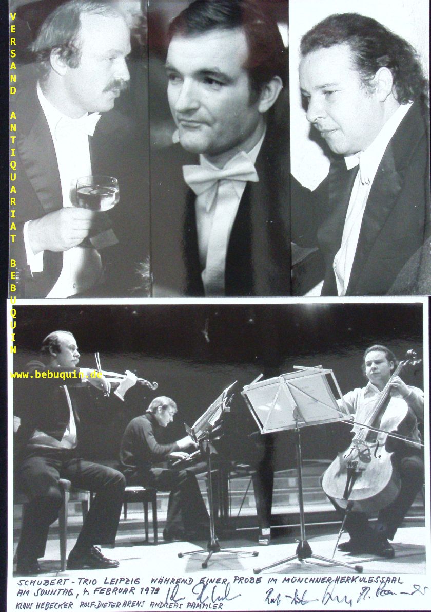 SCHUBERT TRIO.– ARENS, Rolf-Dieter + HEBECKER, Klaus + PAMMLER, Andreas: eigenhändig von allen signiertes großformatiges Fotovon Maria Kanzi: Schubert-Troio Leipzig während einer Probe im Münchner Herkulesaal , München (Herkulessaal), 4.2.1979. 18 x 24 cm 2 Fotos. Rolf-Dieter Arens (* 16. Februar 1945 in Zinnwald) ist ein deutscher Hochschullehrer und Pianist. Von 2001 bis 2010 war er Rektor an der Hochschule für Musik Franz Liszt Weimar. (Wikipedia)