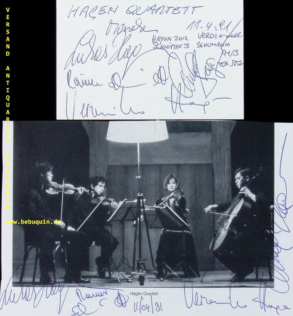 HAGEN QUARTETT.– HAGEN, Lukas + Veronika + Clemens + SCHMIDT, Rainer: eigenhändig signierte und datierte Autogrammkarte + ebensolche Portraitseite. München (Philharmonie), 11.4.1991. 13 x 19,5 cm. 5 Bl.