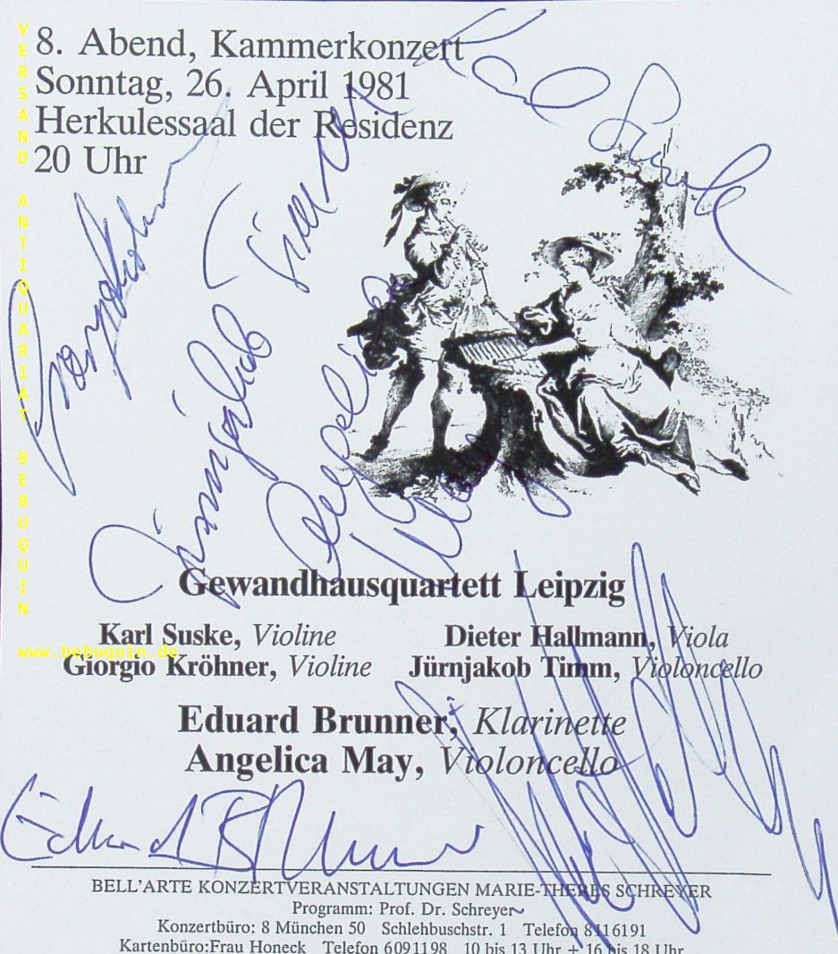 GEWANDHAUS QUARTETT.– MAY, Angelika (Cellistin) + BRUNNER, Eduard (Klarinettist) + SUSKE, Karl + KRÖHNER, Giorgio + HALLMANN, Dietmar + TIMM, Jürnjakob. eigenhändig signierte und datierte Programmseite. Dachau (Schloß), 26.4.1981, 16,5 x 14,5 cm. 1 Bl. Das Gewandhaus-Quartett (auch: Leipziger Gewandhaus-Quartett) ist ein Streichquartettensemble, das 1808 gegründet wurde. Es war eines der ersten Berufsquartette der Welt. In seiner über 200-jährigen Geschichte oblag ihm die Ehre vieler Uraufführungen. (Wikipedia)