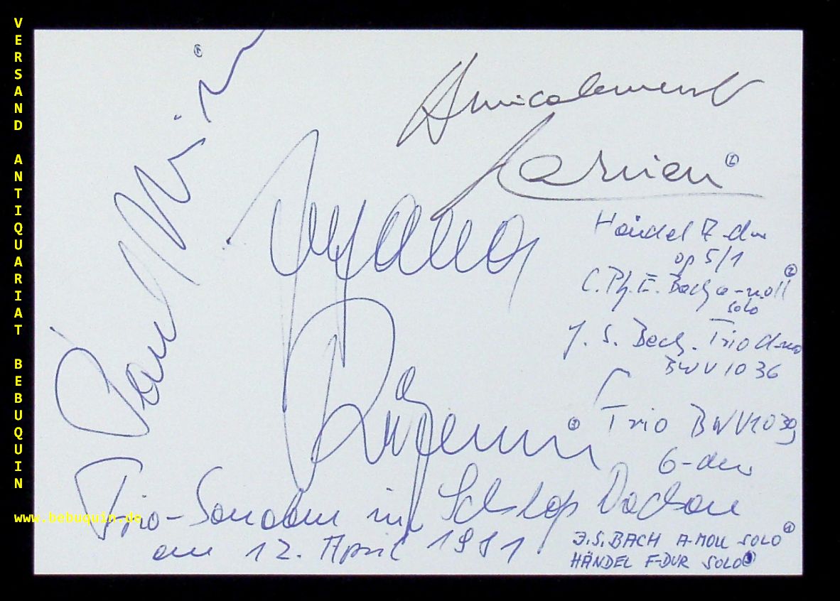 RUZICKOVA, Zuzana (Cembalistin) + MEISEN; Paul (Flötist) + LARRIEU, Maxence (Flötist): eigenhändig von beiden signierte und datierte Autogrammkarte. München, 12.4.1981. 10,5 x 14,5 cm. große Karteikarte. Zuzana Ružicková (* 14. Januar 1927 in Pilsen; † 27. September 2017 in Prag) war eine tschechische Cembalistin und Hochschullehrerin an der Akademie der musischen Künste in Prag. Paul Meisen (* 19. Oktober 1933 in Hamburg; † 23. Juni 2020 in Singenbach) war ein deutscher Flötist und Hochschullehrer. Maxence Larrieu ist ein klassischer französischer Flötist. Ab seinem zehnten Lebensjahr studierte er Flöte am Musikkonservatorium von Marseille bei Joseph Rampal, dem Vater von Jean-Pierre Rampal. 1958 gewann Larrieu den ersten Preis beim Internationalen Genfer Wettbewerb. (Wikipedia)
