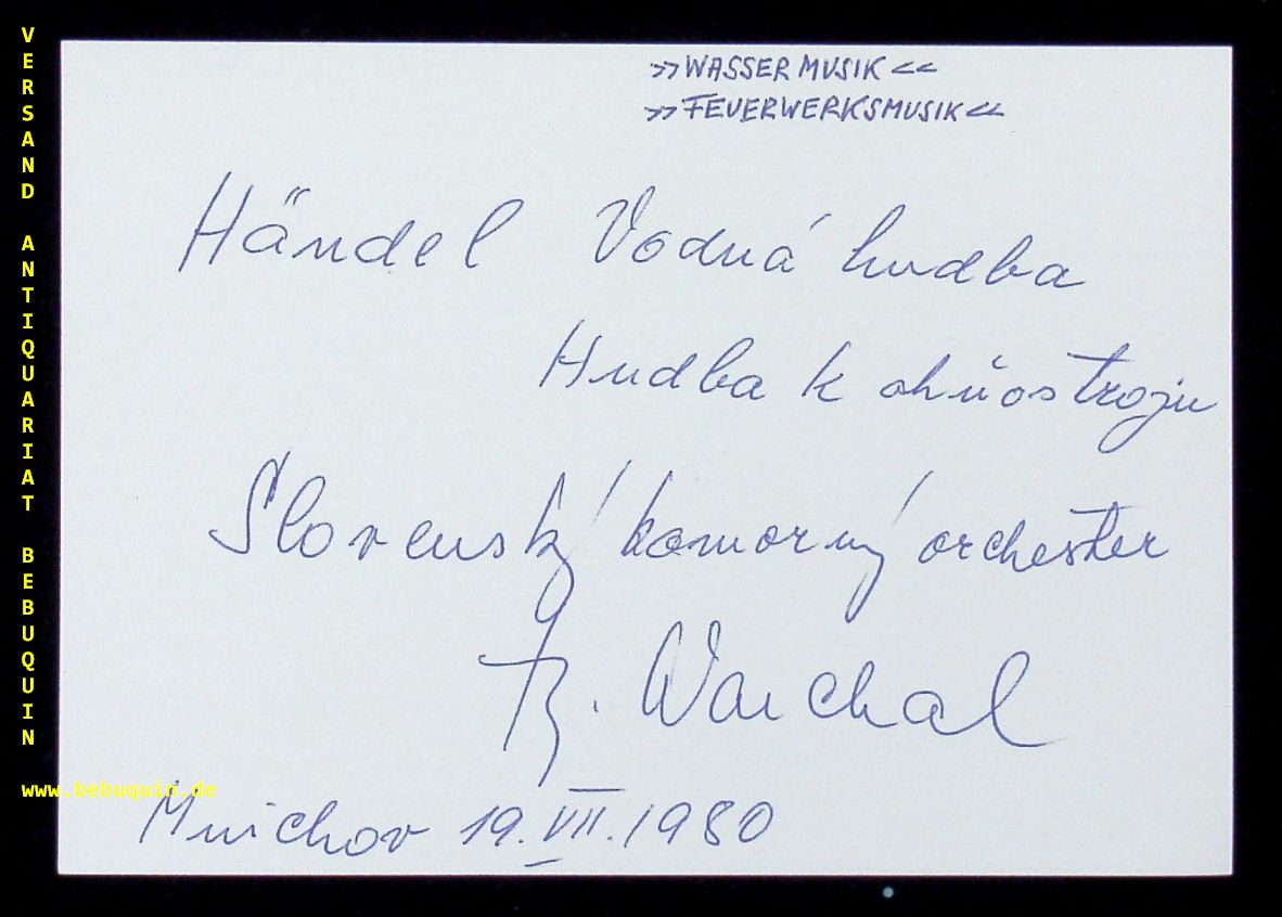 WARCHAL, Bagdan (Dirigent): eigenhändig signierter und datierter Autogrammkarte. München, 19.7.1980. 10,5 x 14,5 cm. große Karteikarte. Bohdan Warchal (* 27. Januar 1930 in Orlová, Tschechoslowakei; † 30. Dezember 2000 in Bratislava, Slowakei) war ein slowakischer Violinist, Mitglied des Slowakischen Philharmonischen Orchesters sowie Leiter und Solist des Slowakischen Kammerorchesters. (Wikipedia)
