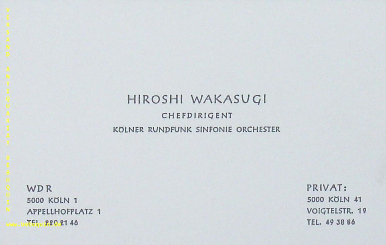 WAKASUGI, Hiroshi (Dirigent): original Visitenkarte. München (Philharmonie), 1978. 7 x 10,5 cm. 2 Bl. Hiroshi Wakasugi (* 31. Mai 1935 in New York; † 21. Juli 2009 in Tokio) war ein japanischer Dirigent. Wakasugi führte viele der wichtigsten europäischen Opern zum ersten Mal in Japan auf und wurde dafür mehrfach ausgezeichnet. Gabriele Maria Ronge (* 1957 in Hannover) ist eine deutsche Opernsängerin (dramatischer Sopran), die vor allem als Interpretin der großen Partien von Richard Wagner und Richard Strauss bekannt ist. (Wikipedia) Willi Seifert berichtet: „Anne Fournet sehr gut (Gespräch, Autogramm). Wiedersehen mit Wakasugi (Interessante Auführung).“