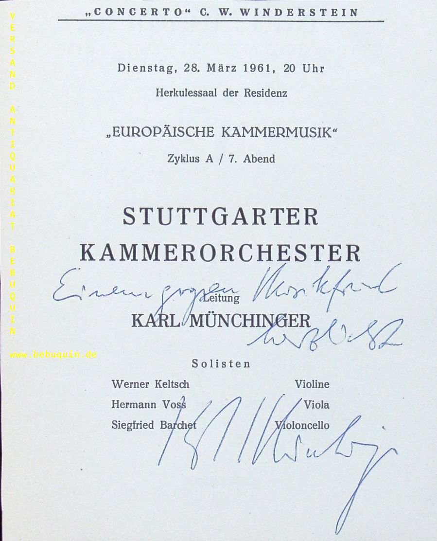 MÜNCHINGER, Karl (Dirigent): eigenhändig signierte Programmseite. Einem großen Musikfreund herzlichst. München (Philharmonie), 28.3.1961. 18 x 14 cm. 1 Bl. Karl Münchinger (* 29. Mai 1915 in Stuttgart; † 13. März 1990 ebenda) war ein deutscher Dirigent. (Wikipedia)