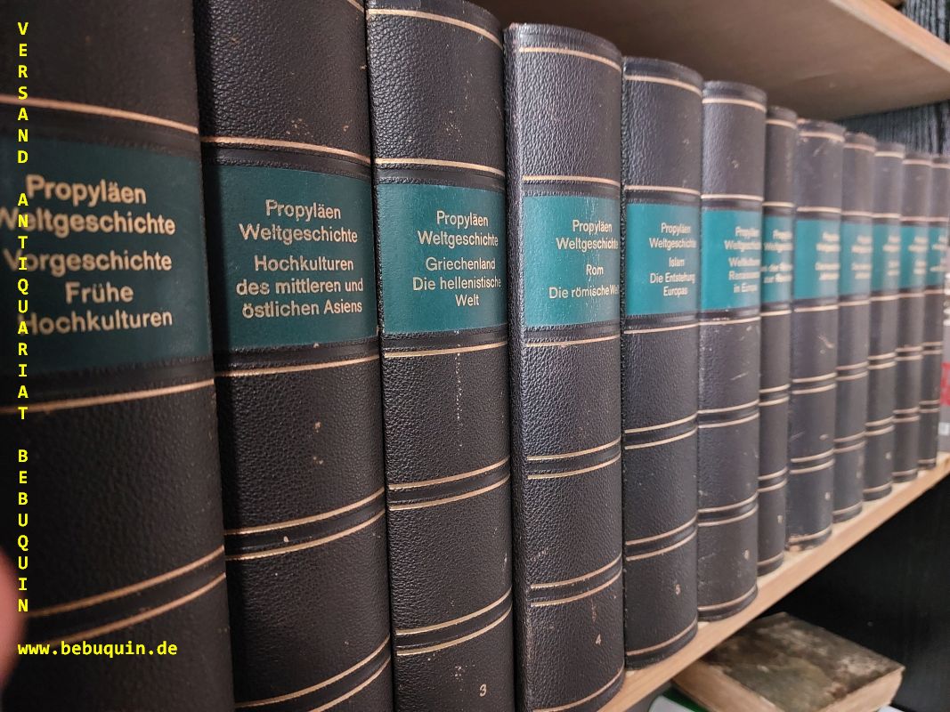 MANN, Golo & HEUSS, Alfred und LYNAR, Ernst Wilhelm Graf: (Hrsg.) Propyläen Weltgeschichte. Eine Universalgeschichte. Bd. 1: Vorgeschichte – Frühe Hochkulturen. Bd. 2: Hochkulturen des mittleren und östlichen Asiens. Bd. 3: Griechenland – Die hellenistische Welt. Bd. 4: Rom – Die römische Welt, Bd. 5: Islam – Die Entstehung Europas. Bd. 6: Weltkulturen – Renaissance in Europa. Bd. 7: Von der Reformation zur Revolution. Bd.8: Das neunzehnte Jahrhundert. Bd. 9: Das zwanzigste Jahrhundert. Bd. 10: Die Welt von heute. Bd. 11: Summa Historica. Bd. 12: Bilder und Dokumente. 12 Bände. Berlin (Propyläen), 1961-65. je Band ca. 800 Seiten, reich illustriert mit Abbildungen auf Tafeln, teilweise in Farbe, Faksimiles, farbige Landkarten, Zeichnungen und graphische Darstellungen. OHLdr mit grünejn goldgeprägten Rückenschildern. Kanten und Ecken gering berieben, insgesamt gutes und dekoratives Ex. Repräsentative Ausgabe in Halbleder.