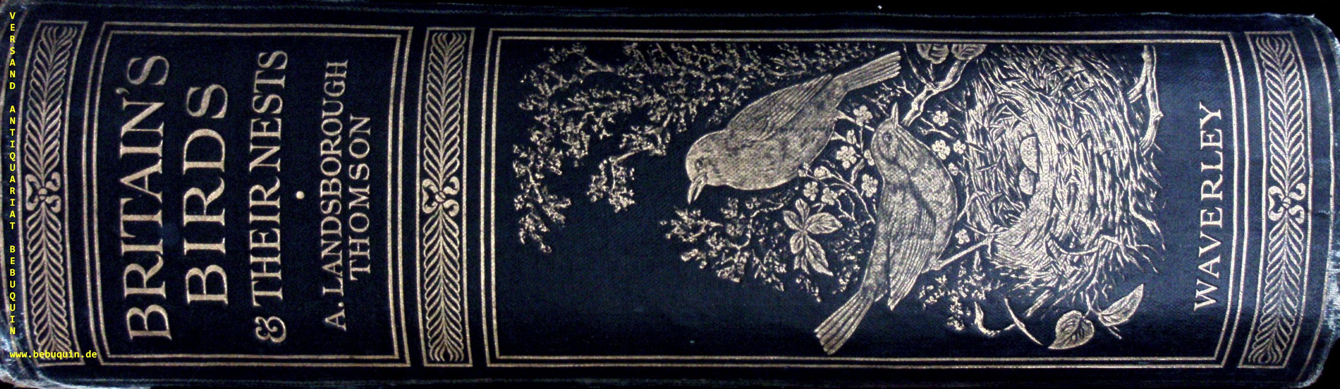 ORNITHOLOGIE.– THOMSON, A. Landsborough: Britain’s Birds and their Nests. With introduction by J. Arthur Thomson. London (Waverley), (1930). Gr. 8°. XXVIII, 340 S. + 132 Farbtafeln von George Rankin. OHLdr mit goldgeprägtem Rücken. Titelseite und Schnitt stärker stockfleckig, sonst gutes Ex. recht seltene Ausgabe.
