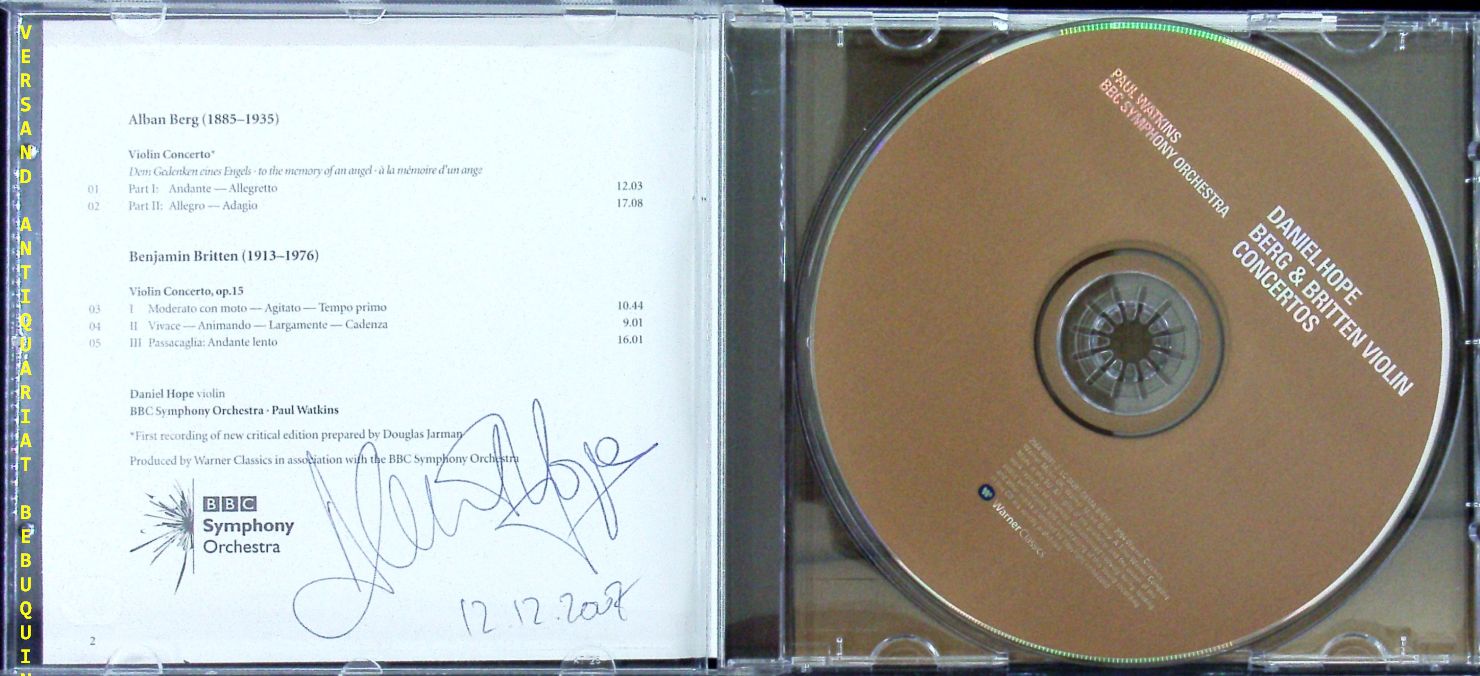 KLASSIK-CD.– HOPE, Daniel (Violinist): eigenhändig im Booklet signiert. Berg & Britten Violin Concertos. Warner (2564602912), 12.12.2007. Original CD. Daniel Hope (* 17. August 1973 in Durban, Südafrika) ist ein irisch-deutscher Geiger, der in England aufgewachsen ist. Er wurde unter anderem durch seine Zusammenarbeit mit Yehudi Menuhin und als Mitglied des Beaux Arts Trios bekannt, aber auch als Initiator musikalischer Projekte, Moderator in Fernseh- und Hörfunksendungen und als Autor mehrerer Bücher. Seit 2016 leitet er das Zürcher Kammerorchester. (Wikipedia)