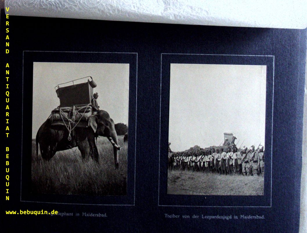 ASIEN.– WILHELM, Kronprinz von Preussen: Erinnerungen an meine Reise nach Indien. Photographische Aufnahmen von der Indien-Reise seiner Kaiserlichen und Königlichen Hoheit des Kronprinzen des Deutschen Reichs und von Preussen. Berlin (Stilke), 1910. Gr. 4°. 68, davon 11 farbige, Aufnahmen auf 52 kartonierten Tafeln, in Leinen Flügelmappe mit Deckeltitel in Handschrift. In neuem Schuber. gutes Ex. EA mit den eindrucksvollen Jagdschnappschüssen.