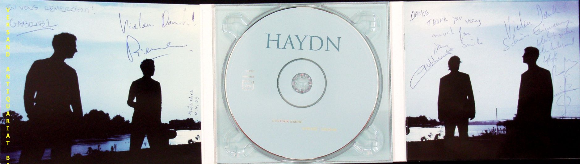 KLASSIK-CD.– QUATUOR EBENE – COLOMBET, Pierre + LE MAGADURE, Gabriel + HERZOG, Mathieu + MERLIN, Raphael: eigenhändig von allen im Booklet signiert und datiert: Thank you very much for smile in 4 Sprachen.. Haydn: Quatuors a Cordes. Sacem (MIR 013=, 4.4.2006. Original CD. Quatuor Ébène (dt. „Ebenholz-Quartett“) ist ein französisches Streichquartett, das sich 1999 am Konservatorium für Musik, Tanz und Theater in Boulogne-Billancourt gründete. Das Repertoire umfasst klassische und zeitgenössische Musik mit gelegentlich fließendem Übergang zum Jazz. (Wikipedia)