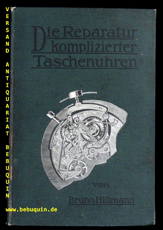 UHREN.– HILLMANN, Bruno: Die Reparatur komplzierter Taschenuhren. Für den Selbstunterricht des Uhrmachers. Berlin (Marfels), 1911. 3 Bl., 112 S. mit 88 Holzschnitten und 5 Falttafeln im Anhang. ill. OLn. mit Silberprägung. NaT, teils etwas stockfleckig. EA.