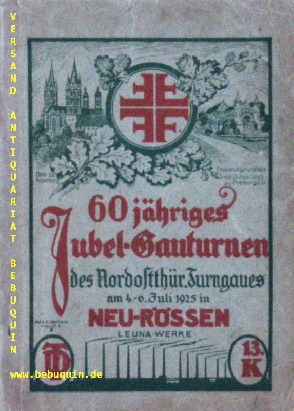 LEUNA.– 60 JAHRIGES JUBEL-GAUTURNEN.– Des Nordostthüringischen Turngaues Neu-Rössen. Neu-Rössen (Leuna-Werke), 4.– 6.Juli 1925. kl. 8°. 72 S. mit zahlr. Abb. ill. OKart. Kanten etwas bestoßen. seltene EA.