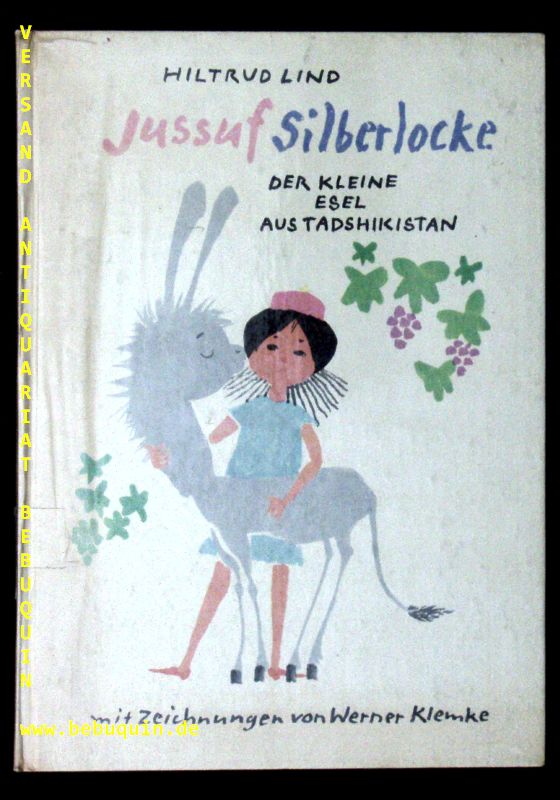 LIND, Hiltrud: Jussuf Silberlocke. Der kleine Esel aus Tadschikistan. Berlin (Holz), 1964. Oktav. 20 Bl. mit Abb. von Werner Klemke. farb. ill. OPb. letzte Seite mit Randknick, foliert. 1. Aufl. dieser Ausgabe. Kunze, Klemke 449.