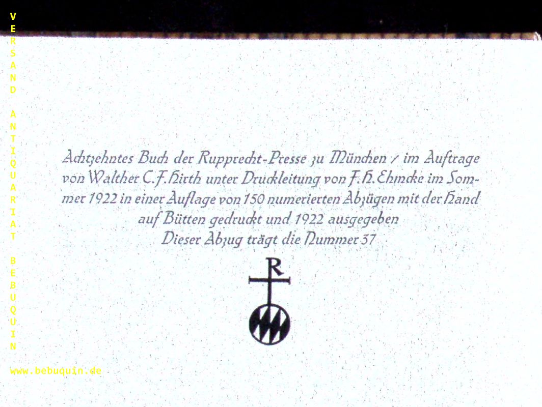 LAVATER, Johann Caspar: Vermischte physiognomische Regeln. Ein Manuscript für Freunde. München (Hirth), 1922. Gr. 8°. 39 S. auf unbeschnittenen Bütten. farb. ill. InterimsPb. Kapitale lädiert, innen tadellos. = Buch der Rupprecht-Presse, 18. Nr. 37 von 150 Ex. der EA. Rodenberg 131.