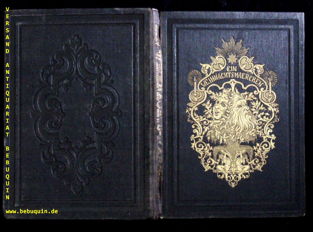 LÖFFLER, Ludwig: Ein Weihnachtsmärchen. Leipzig (Weber), 1849. 12°. VI, 98 S. mit zahlr. Holzschnittill. des Autors. OLn mit goldgeprägter eindrucksvoller Deckelvignette und blindgeprägter Vignette auf Rückdeckel. Vorsätze stark oxidiert, Blattränder teils fingerspurig oder gebräunt, insgesamt durchaus noch gut erhalten. Diese Erstausgabe in Buchformat wird von keiner Bibliothek verzeichnet. Am 25. Dezember 1847 erschien die Geschichte unter dem Titel „Knechts Ruprechts Wanderung. Ein Weihnachtsmärchen“ in der „Illustrirten Zeitung“. Der Illustrator und wahrscheinlich auch der Autor der Geschichte, Ludwig Löffler (1819-1876), illustrierte u. a. Werke von Ch. Dickens, die deutlich machten, dass Fantasie nicht mehr schädliche Einbildungskraft war. Atmosphärisch ist die vorliegende Erzählung in die bürgerlichen ‚Weihnachtsparties‘ der Zeit verlegt. Weihnachten ist noch nicht das brave, ernsthafte Fest der deutschen Seele, sondern ein geselliges, vergnügliches Spiel für Erwachsene und Kinder, Familie und Freunde. Die Eerzählung war also für Erwachsene gedacht und nicht für Kinder. Die Erzählung führt einen jungen Mann, dessen Fantasie durch den Grog entzündet wurde, in seinem nächtlichen Traum in die Welt der Geister (Martina Eberspächer: Der Weihnachtmann, 137ff). (hier folge ich der vorbildlichen Beschreibung von Christine Laist)