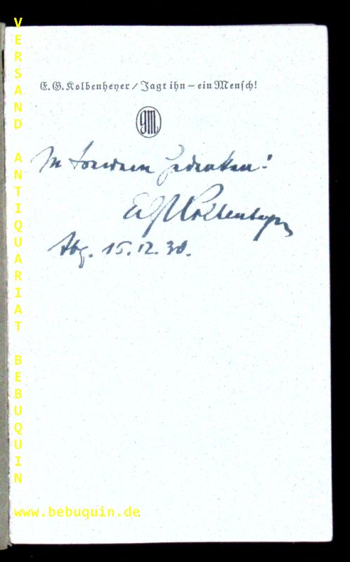 KOLBENHEYER, E.G.: Jagt ihn – ein Mensch! Schauspiel in fünf Aufzügen. München (Georg Müller), 1931. 97 (3) S. OBr. Kapitale etwas bestoßen. EA WG² 28. Mit einer 3zeiligen eigenhändigen voll signierten und datierten Verfasserwidmung auf Vortitel.