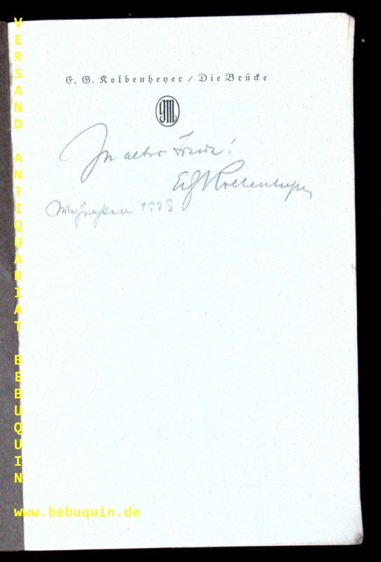 KOLBENHEYER, E.G.: Die Brücke. Schauspiel in vier Aufzügen. München (Georg Müller), 1929. Gr. 8°. 80 (2) S OBr. Rücken etwas geblichen . EA WG² 21. Mit einer 3zeiligen eigenhändigen voll signierten und datierten Verfasserwidmung auf Vortitel.
