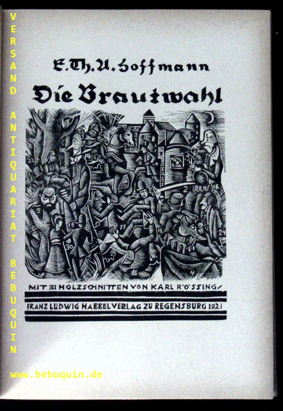 RÖSSING.– HOFFMANN, E. T. A.: Die Brautwahl. 1.-3. Tsd. Regensburg (Habbel), 1921. Gr. 8. 100 S. mit 31 Origonal Holzschnitten von Karl Rössing. OLn. Einband etwas angeschmutzt. 1.– 3. Tsd. dieser Ausgabe.