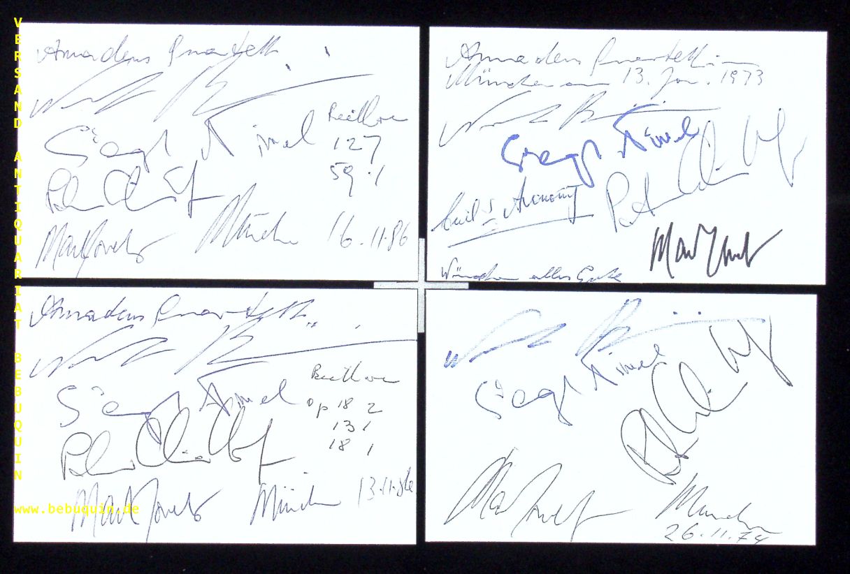 AMADEUS QUARTET.– SCHIDLOF, Peter + BRAININ, Norbert + NISSEL, Siegmund + LOVETT, Martin: 7 eigenhändig und jeweils von allen signierte und datierte Autogrammkarten. München, 1974 – 1986. 8 x 12,5 cm. 7 Karteikarten. Das Amadeus-Quartett war ein bekanntes Streichquartett des 20. Jahrhunderts. Es wurde 1947 in London gegründet. (Wikipedia)