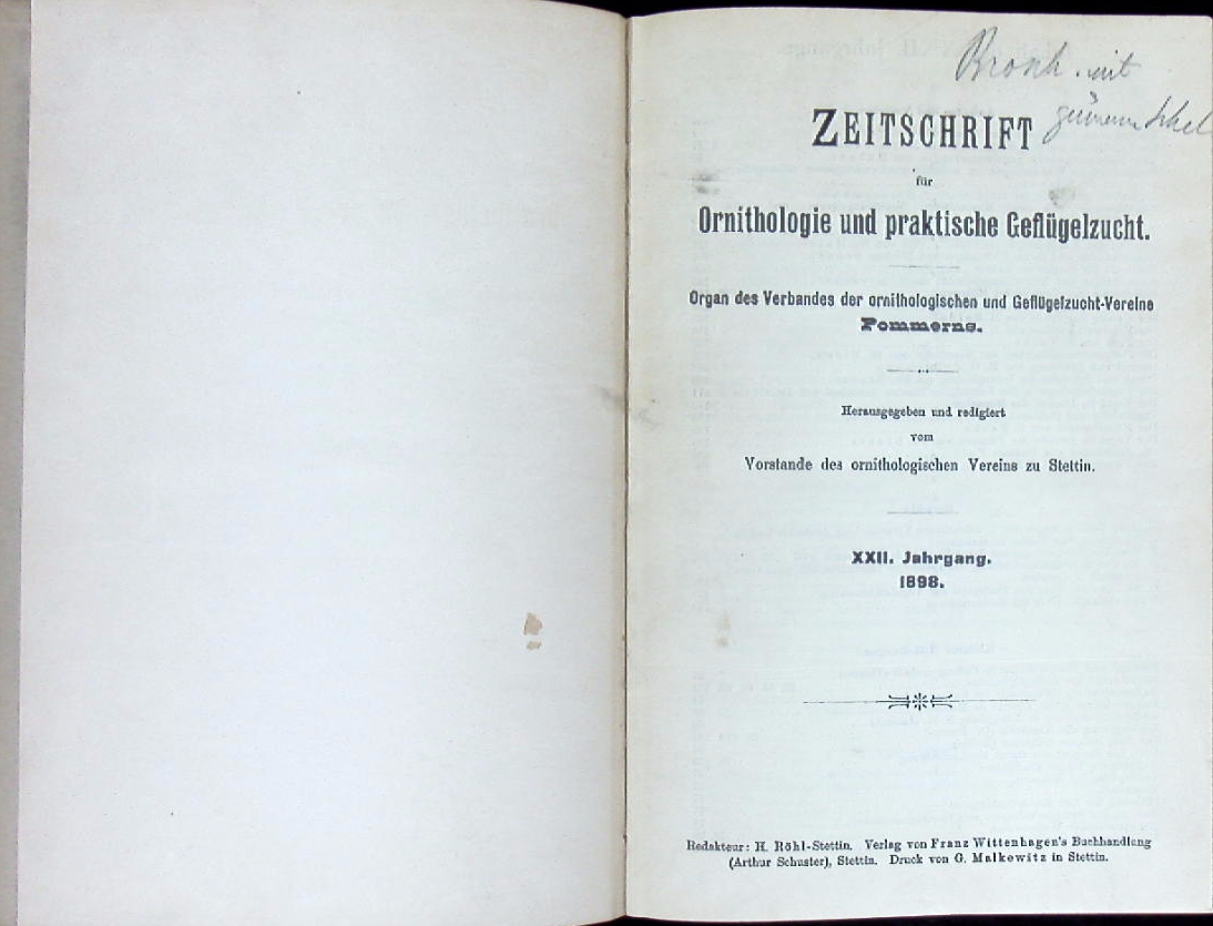 ORNITHOLOGIE.– ZEITSCHRIFT FÜR ORNITHOLOGIE UND PRAKTISCHE GEFLÜGELZUCHT.– XXII. Jahrgang. Organ des Verbandes der Ornithologischen Vereine Pommerns. Heft 1 – 12 in 1 Bd. Stettin (Wittenhagen), 1898. Gr. 8°. 2 Bl., 200 S. mit zahlr. Abb. HLdr der Zeit mit Rückenschild. gutes Ex. rare Publikation.