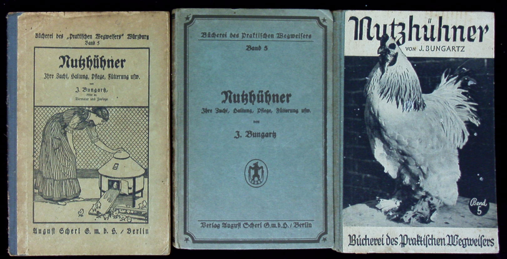 ORNITHOLOGIE.– BUNGARTZ, Jean: Nutzhühner. Ihre Zucht, Haltung, Pflege, Fütterung usw. 6. neubearb. Aufl. Berlin, Scherl, 1921. Oktav. 160 (4) S. mit 119 Abb. ill. OHLn. bzw. OPb. etwas gebräunt = Bücherei des „Praktischen Wegweisers“, Würzburg, Bd. 5. drei unterschiedliche Ausgaben. Preis je Band