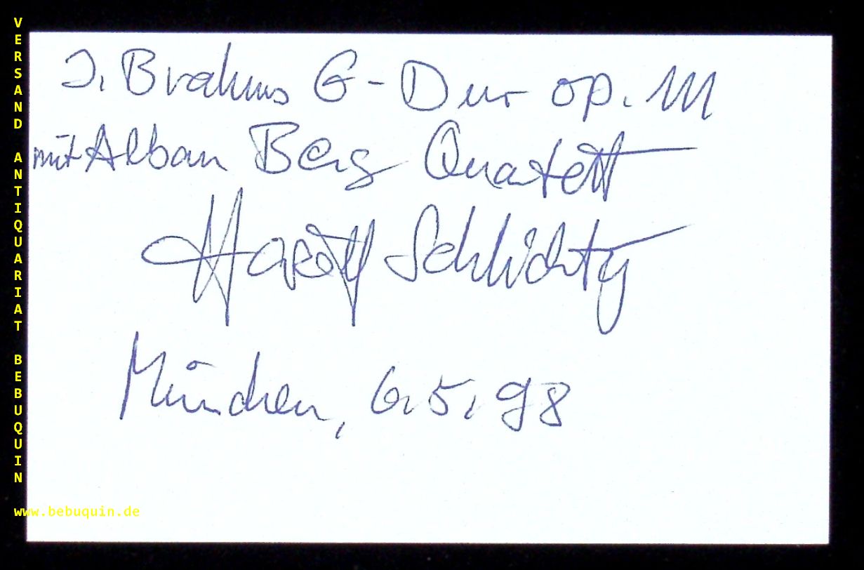 SCHLICHTIG, Hariolf (Bratschist): eigenhändig signierte und datierte Autogrammkarte. München (Herkulessaal), 6.5.1998. 8 x 12,5 cm. Karteikarte. Hariolf Schlichtig, Bratschist ist Professor an der Hochschule für Musik und Theater München.