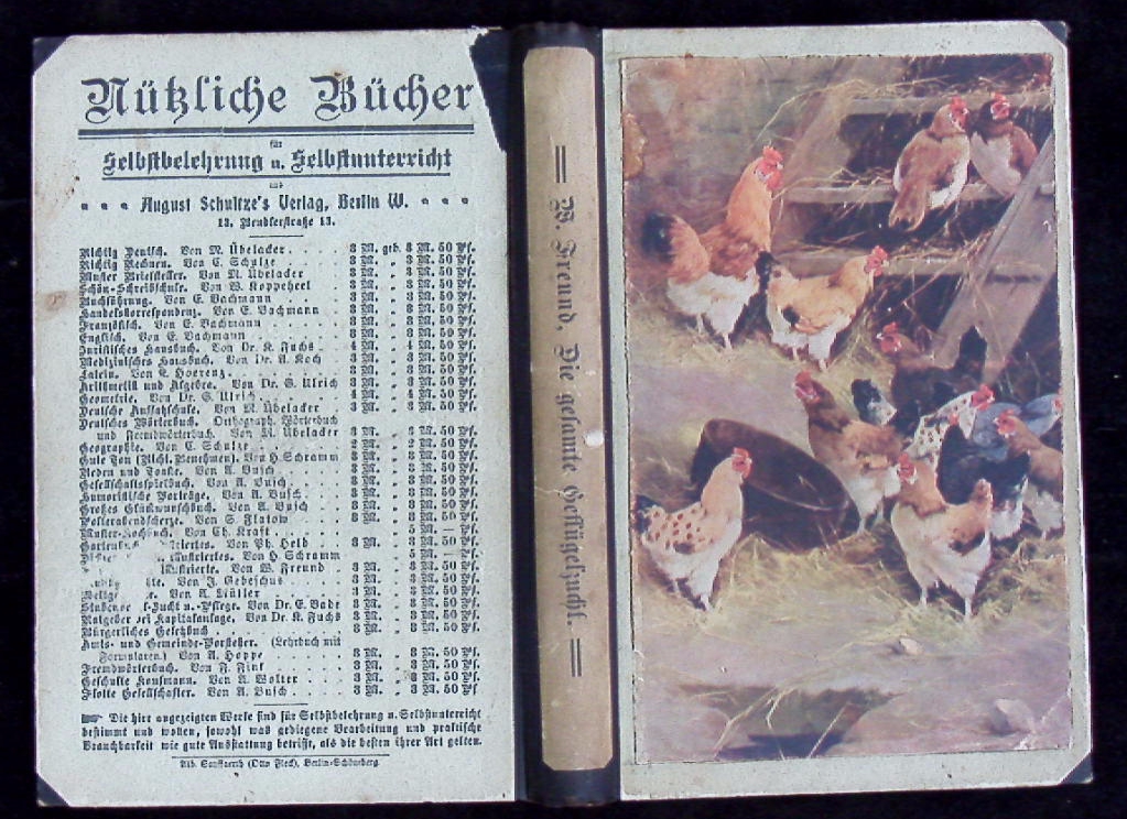 TAUBEN.– FREUND, W.: Die Geflügelzucht. Eine ausführliche Darstellung der gesamten Geflügelzucht speziell der Hühner, Enten, Gänse, Truthühner, Tauben mit Berücksichtigung der künstlichen Brut und Zucht und der Krankheiten, deren Verhütung und Heilung. 5. Aufl. Berlin (Schultze), 1903. 104, 56, 62 (2), 88 (8) S. mit zahlr. Abb. und Bildtafeln. farb. ill. OHLn. gutes Ex. Mit einem 88seitigen Abschnitt: „Die Taube“.