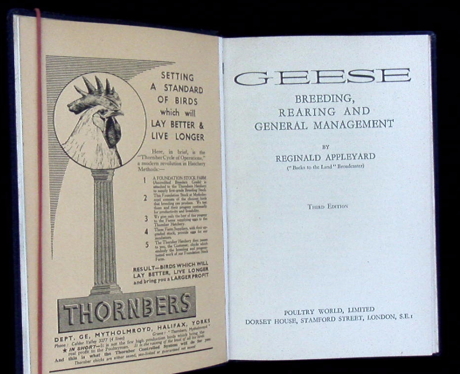 ORNITHOLOGIE.– APPLEYARD, Reginald: Geese. Breeding, rearing and general management. 3. ed. London (Poultry World), ca. 1948. kl. 8°. 100 S. mit zahlr. Abb. neues Ln mit goldgeprägtem Rücken und eingebundenem ill. OKart. gutes Ex. = A poultry world publication.